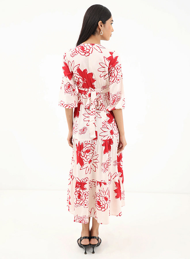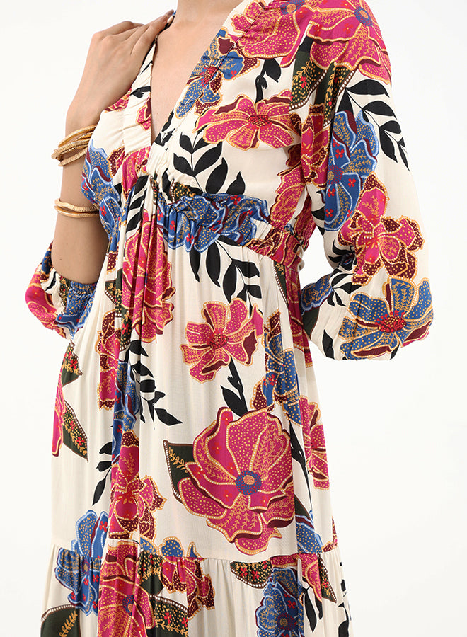 This floaty maxi dress features a V-neckline, full long sleeves with elasticated cuffs and a ruffled skirt with gathered details. The soft viscose fabric gives it a satin-effect making the floral print come to life when worn.