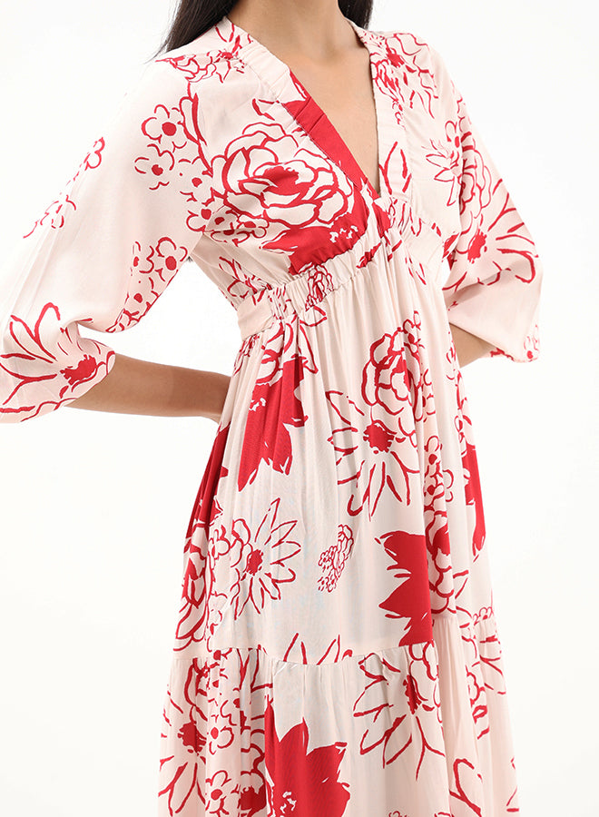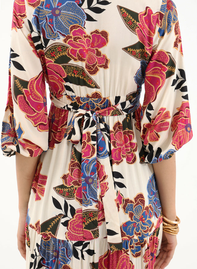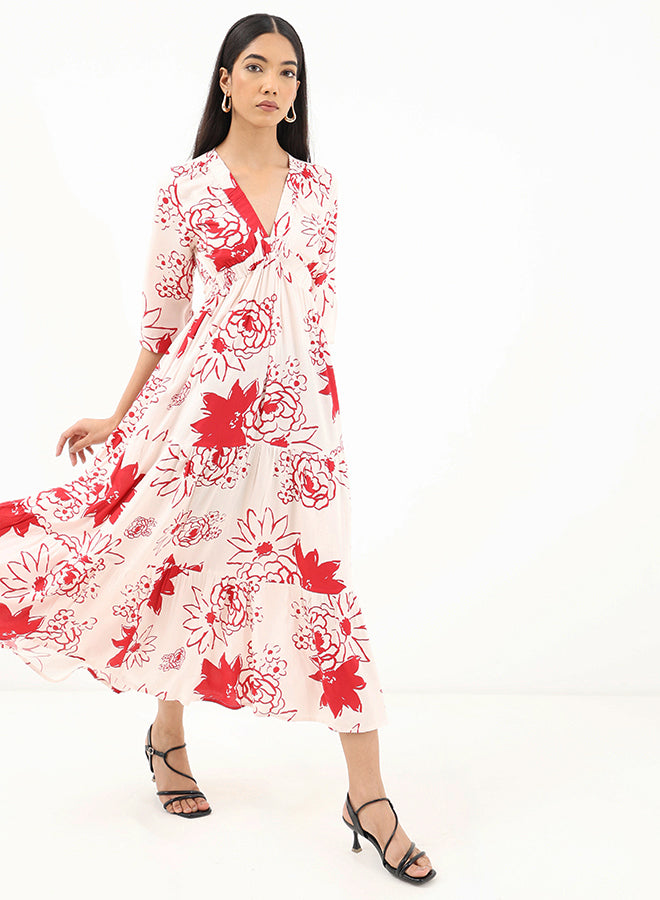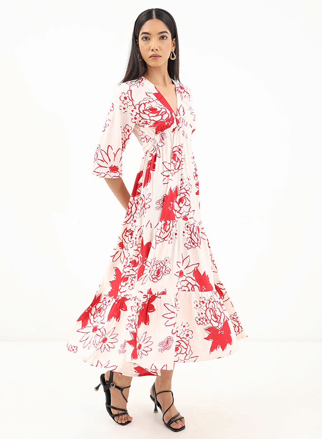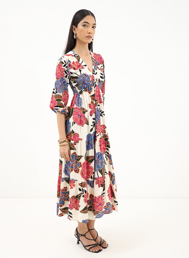This floaty maxi dress features a V-neckline, full long sleeves with elasticated cuffs and a ruffled skirt with gathered details. The soft viscose fabric gives it a satin-effect making the floral print come to life when worn.