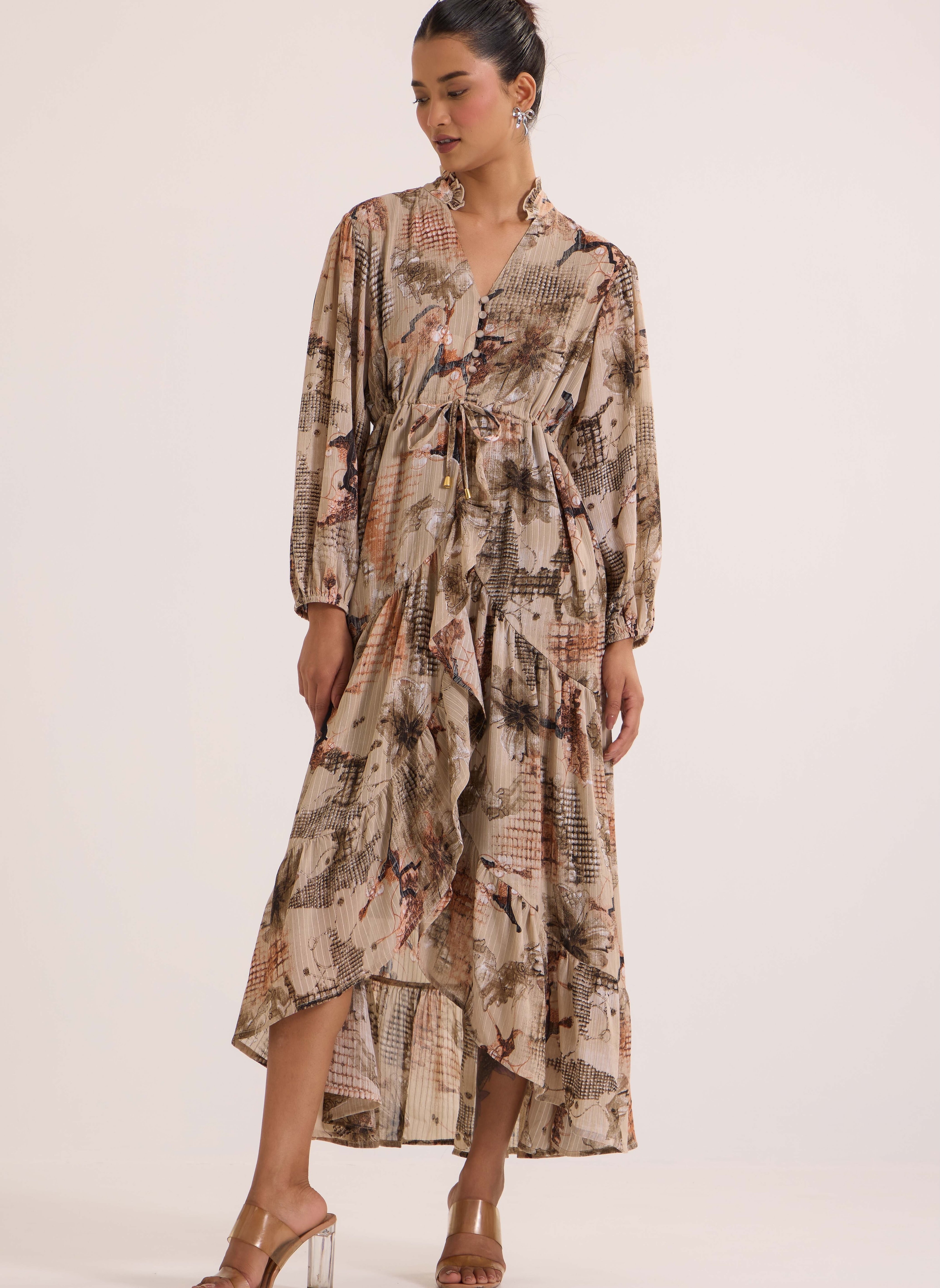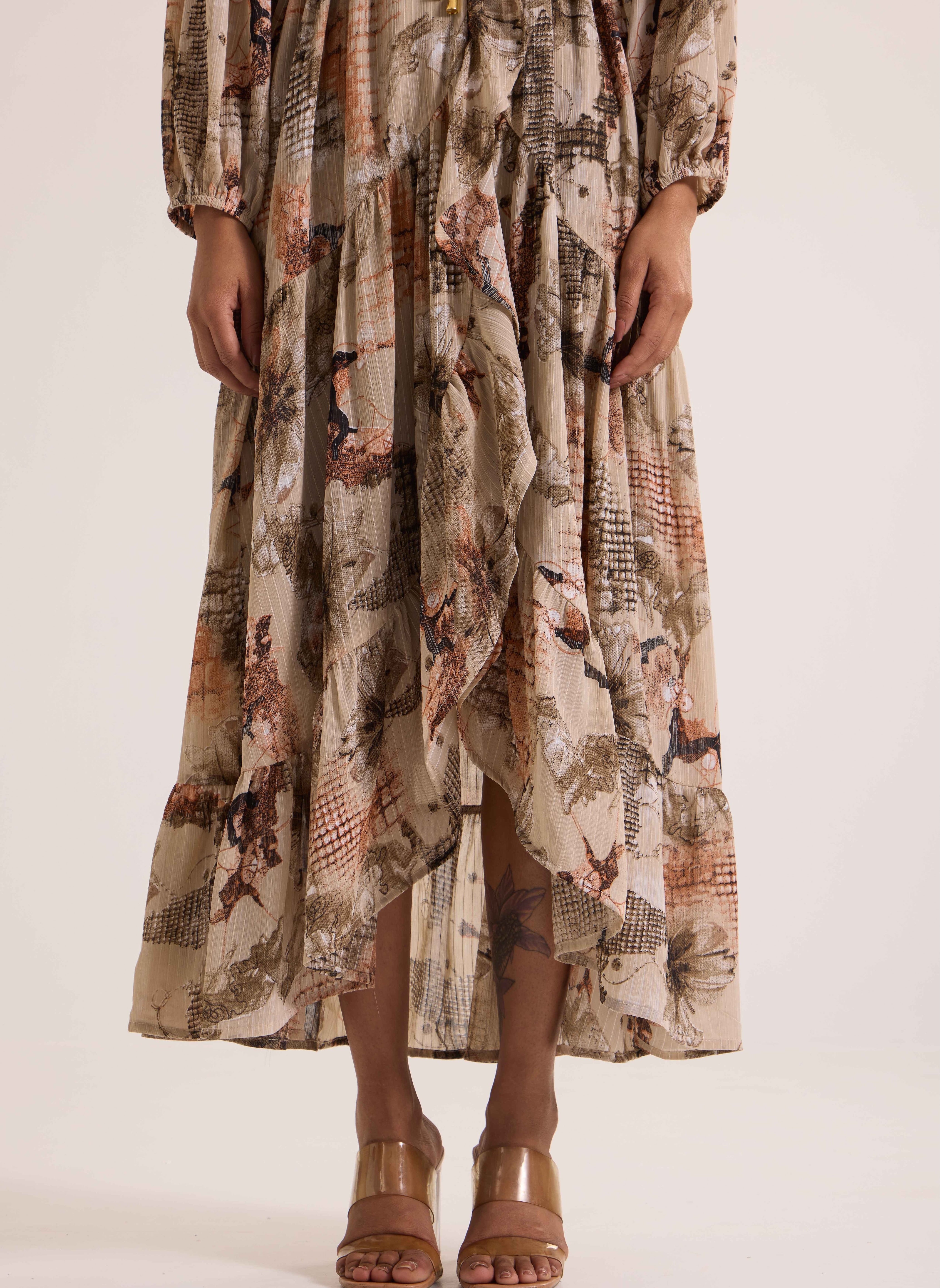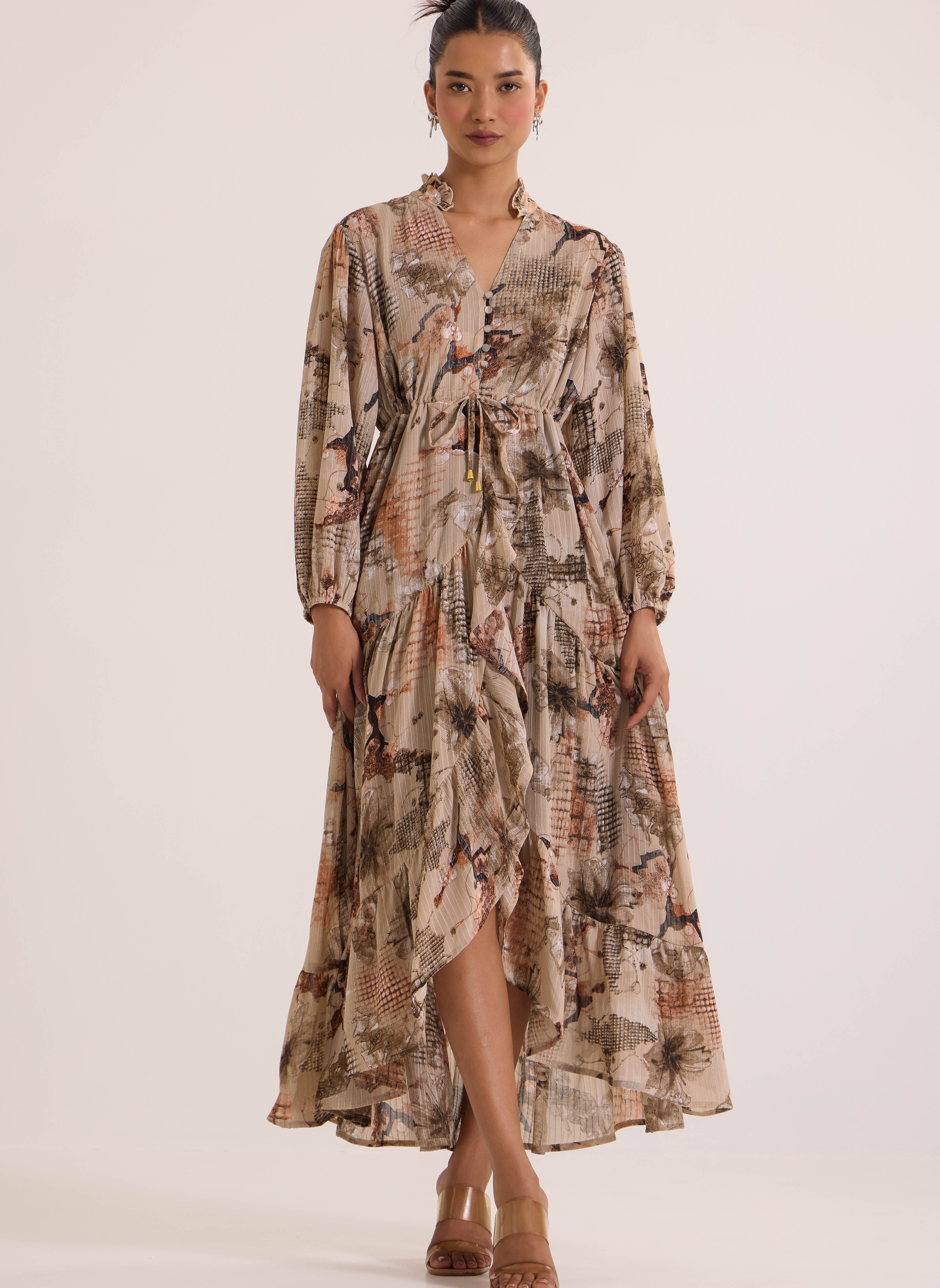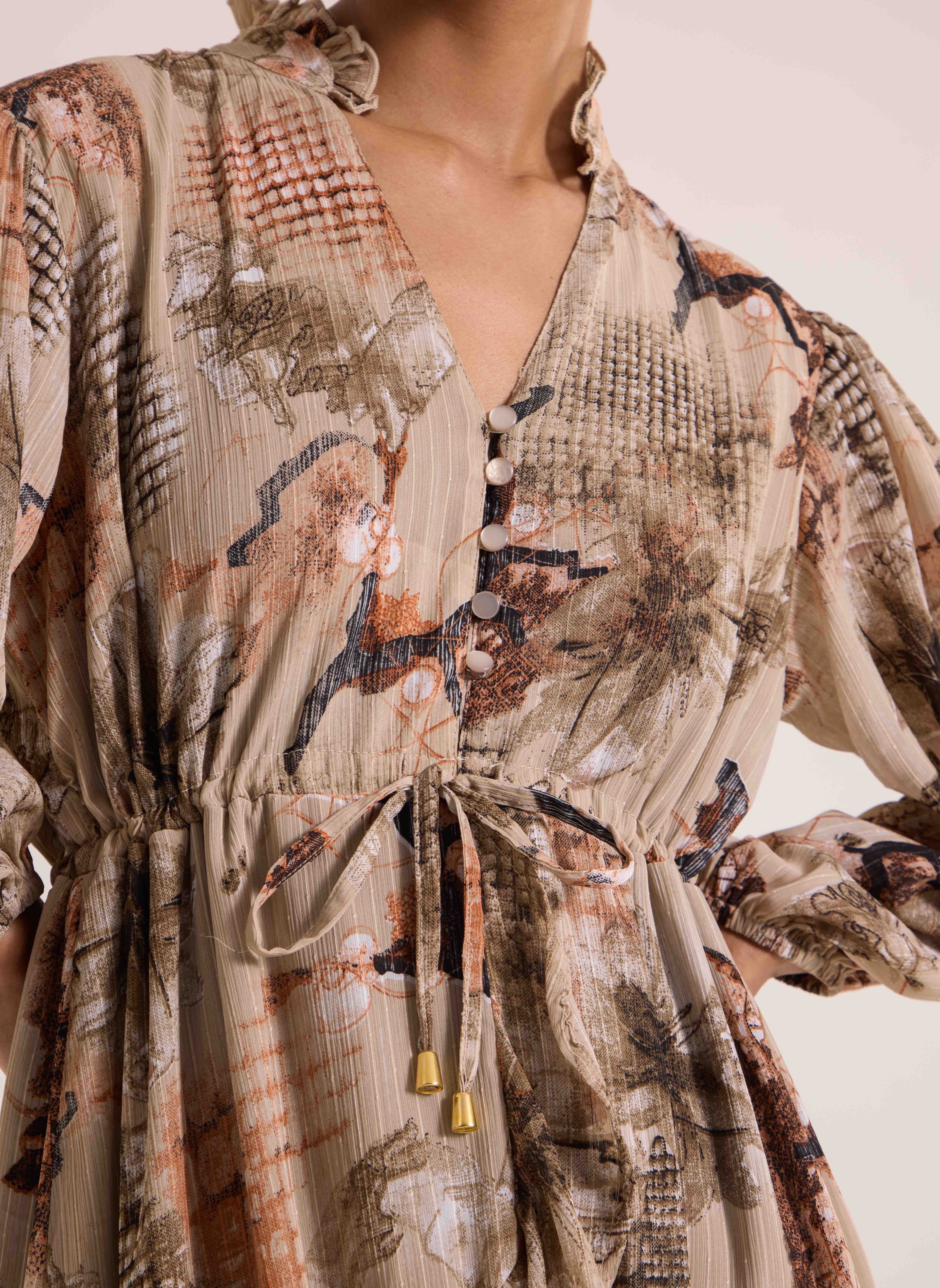 The Alina blends comfort and structure in an easy wrap-style silhouette. Featuring long sleeves, soft ruffle details at the neck, and an abstract print in muted, grounded tones — this piece brings quiet character to your summer wardrobe.
