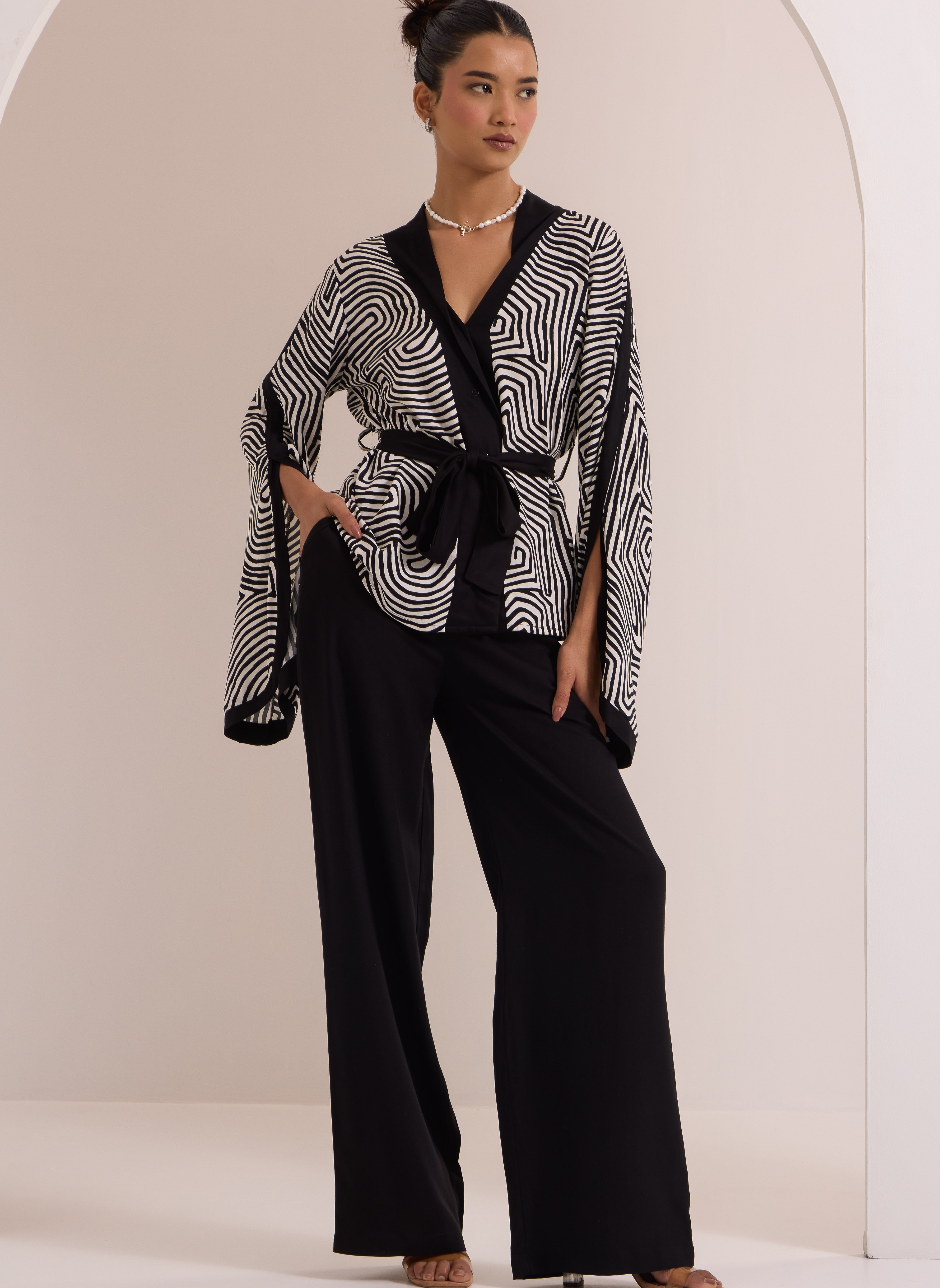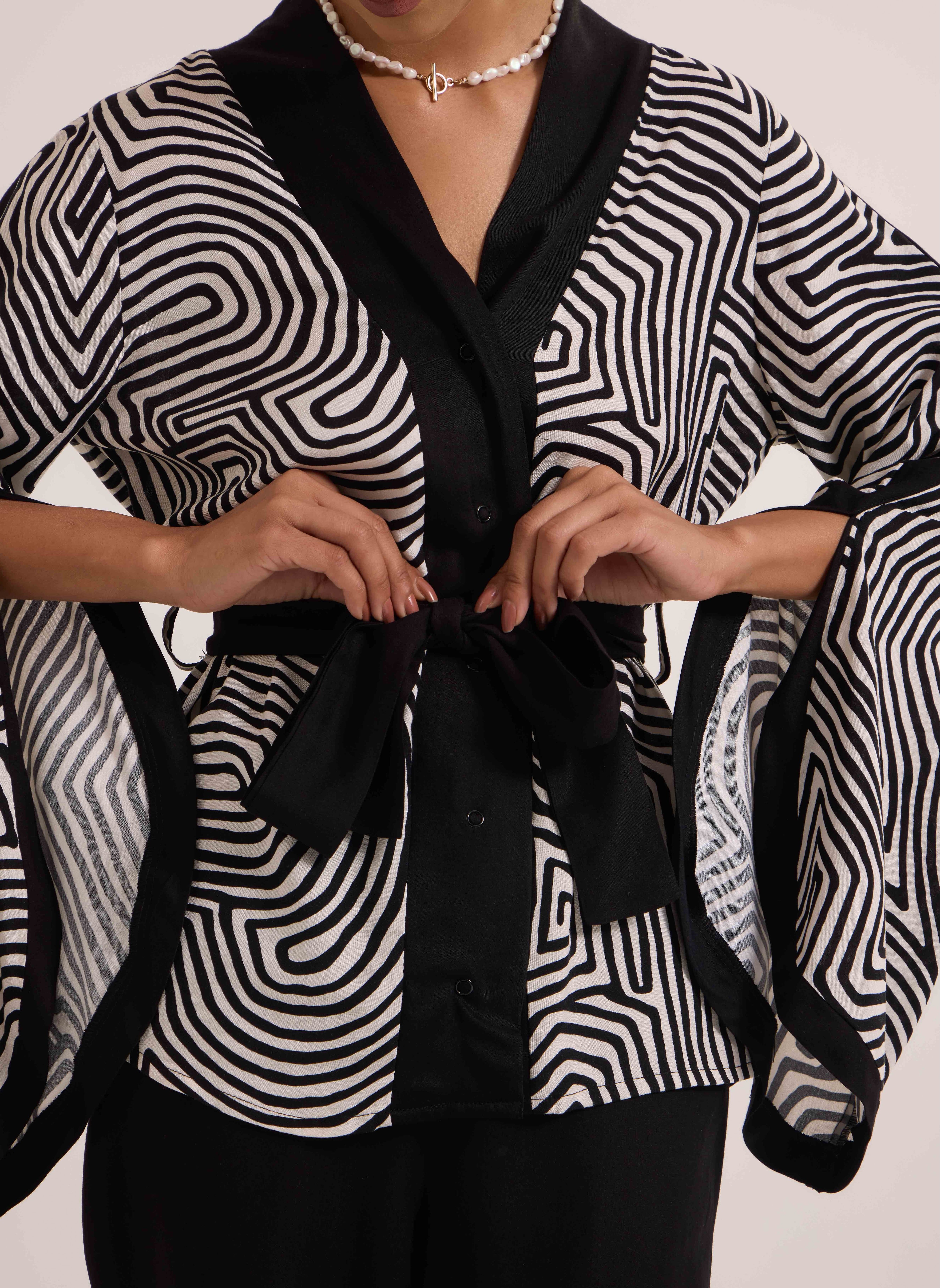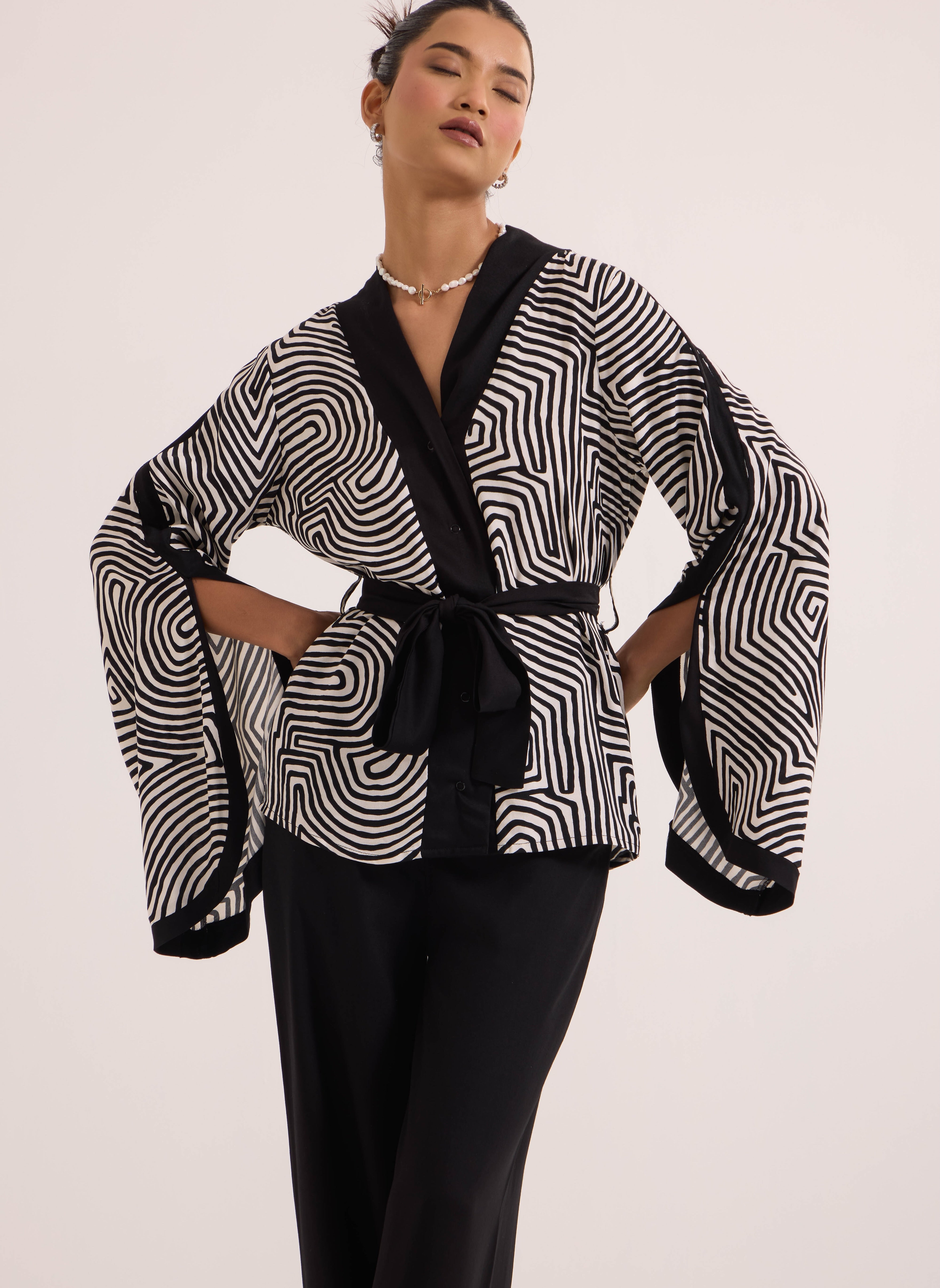 Featuring a maze-like monochrome print, this piece is cut in a relaxed kimono silhouette with wide sleeves, a contrast border, and a soft belt that cinches the waist just right.