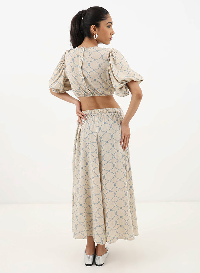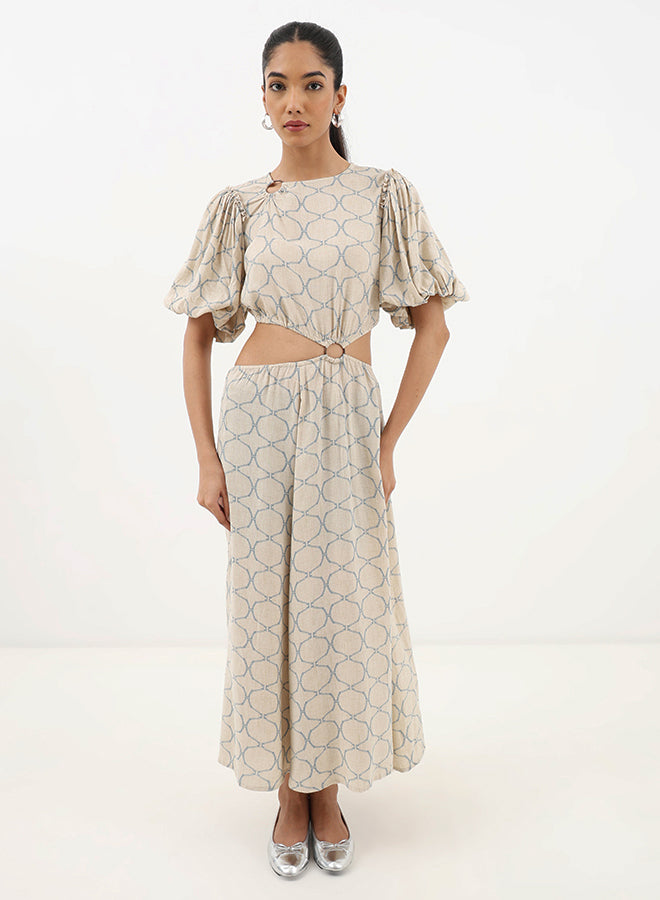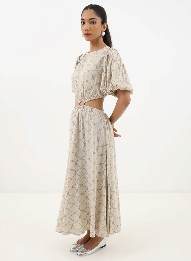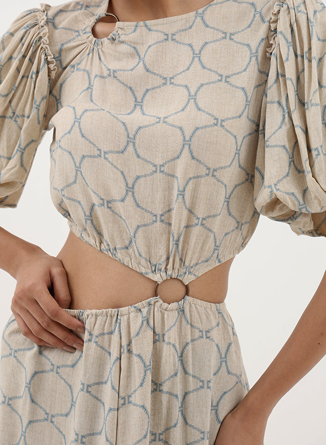 Step into elegance with the Azure Dream Cut-Out Maxi Dress, crafted from 100% viscose in ivory with a striking blue geometric pattern. This dress features chic cut-outs and stylish puffy sleeves, combining modern sophistication with timeless allure. Perfect for making a statement at summer soirées or special occasions, exuding effortless charm and grace wherever you go.