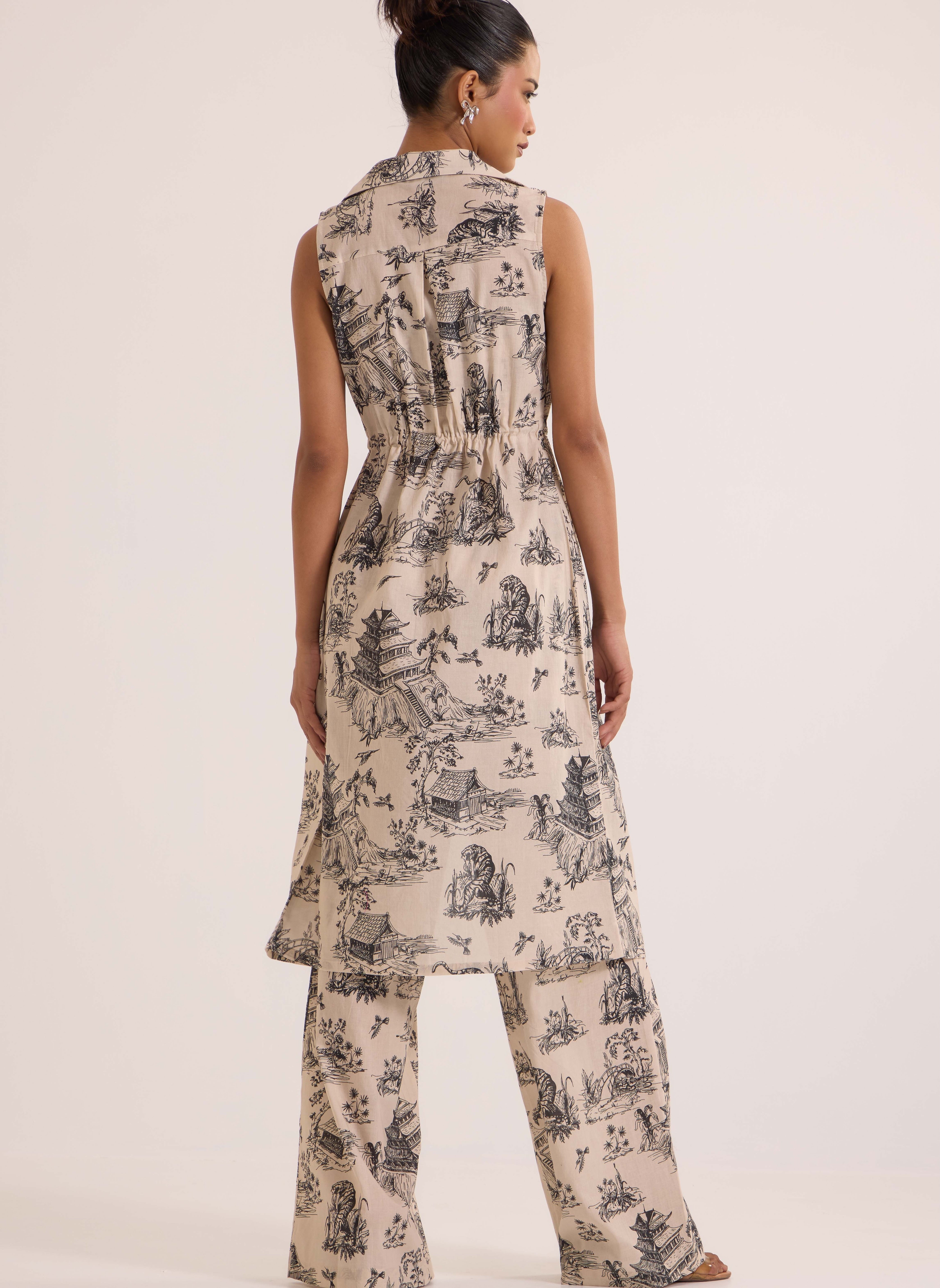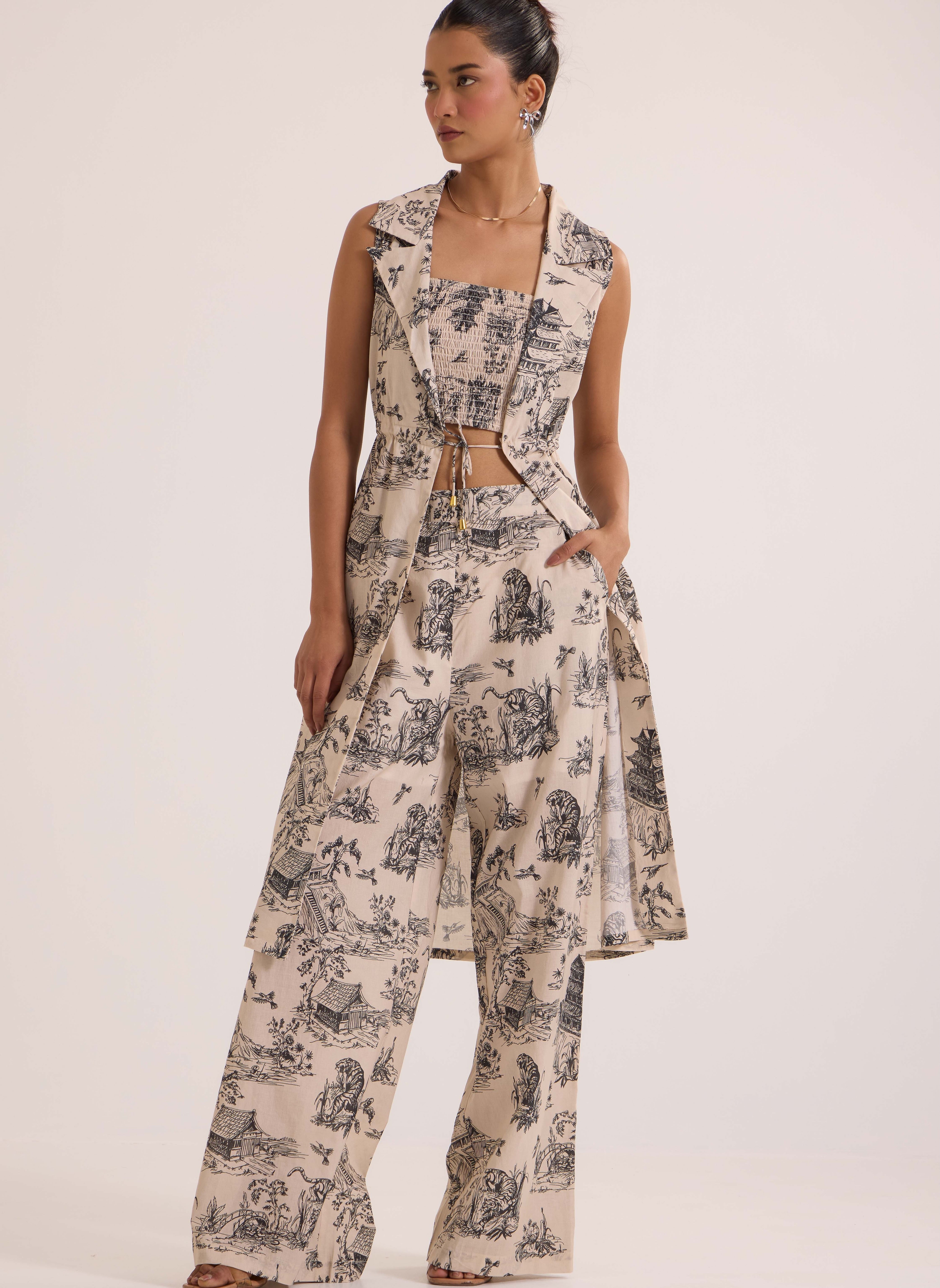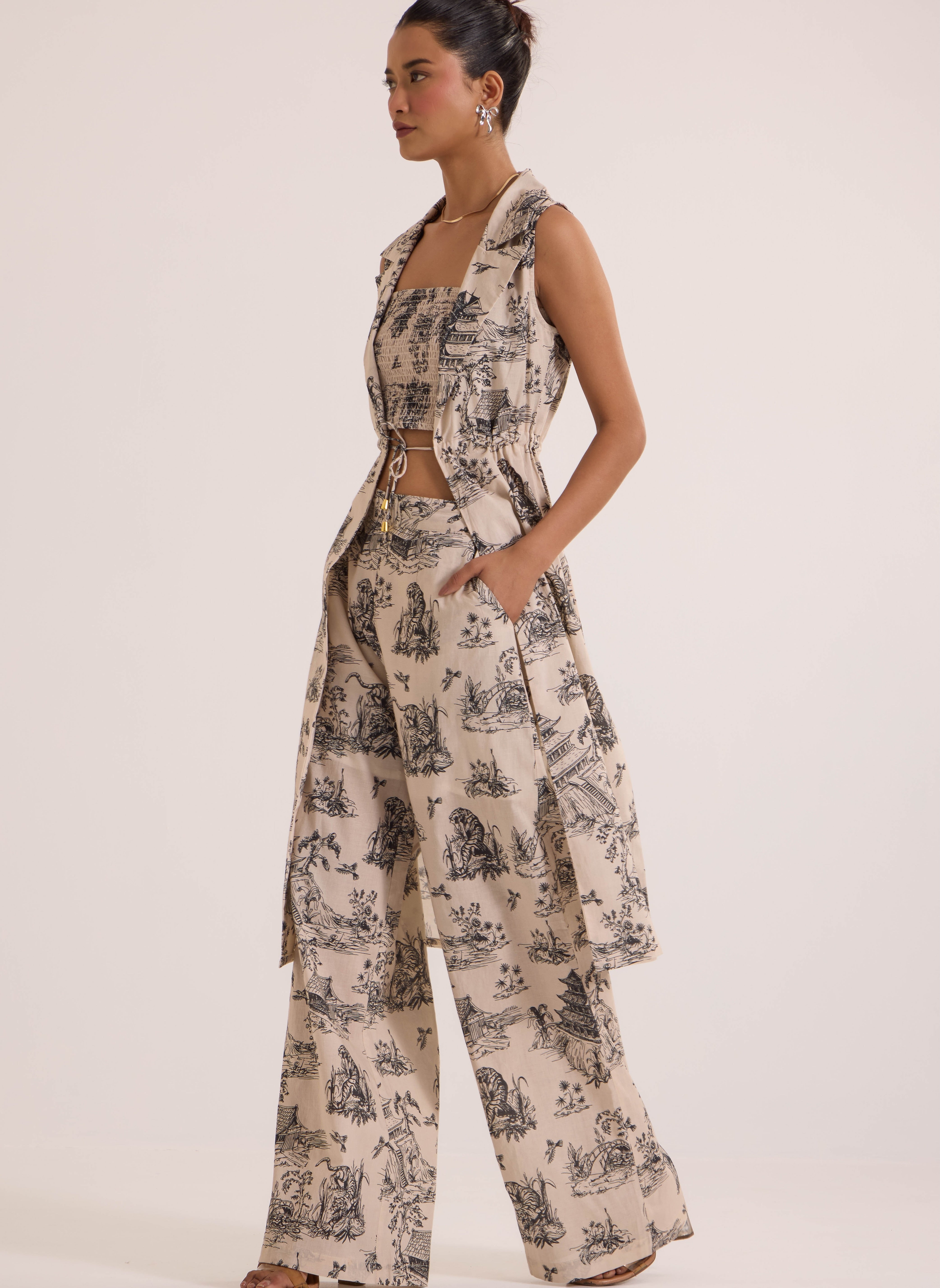 Featuring a three-piece co-ord with a sleeveless open-front jacket, smocked crop top, and wide-leg trousers, The Ayra Set blends ease with structure. The monochrome print adds a refined, art-inspired edge, while the relaxed tailoring keeps it wearable for both day and night.